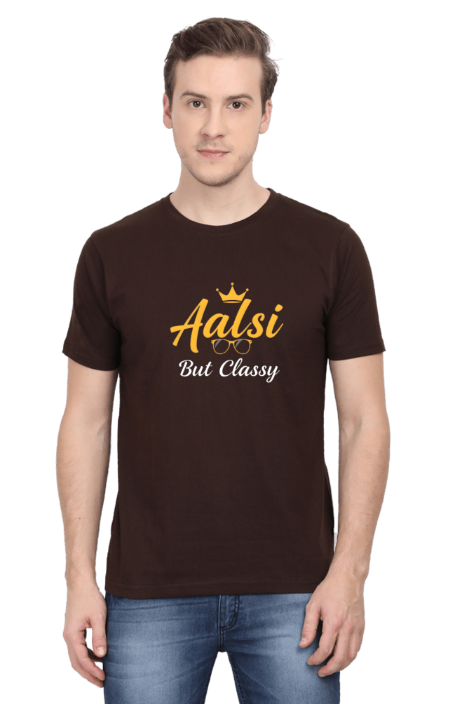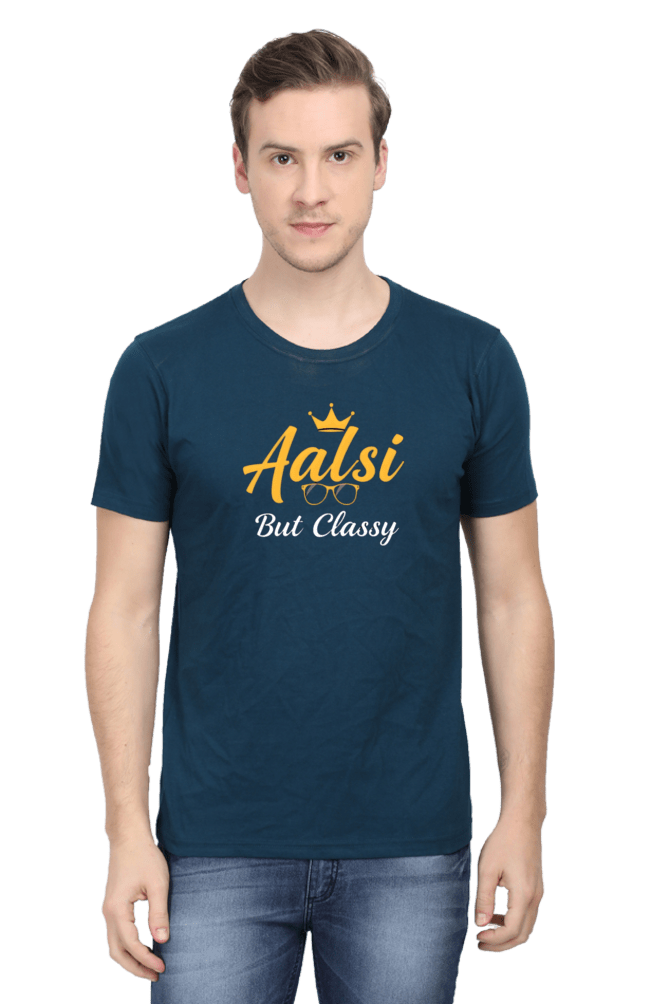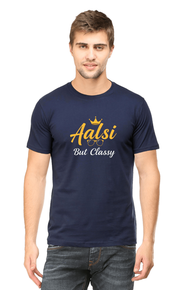 Embrace effortless style with our Men’s Classic Crew T-Shirt featuring the bold and witty slogan “Aalsi but Classy” alongside a stylish crown and sunglasses icon. Designed for those who like to keep it cool while staying effortlessly elegant, this tee blends comfort with personality.